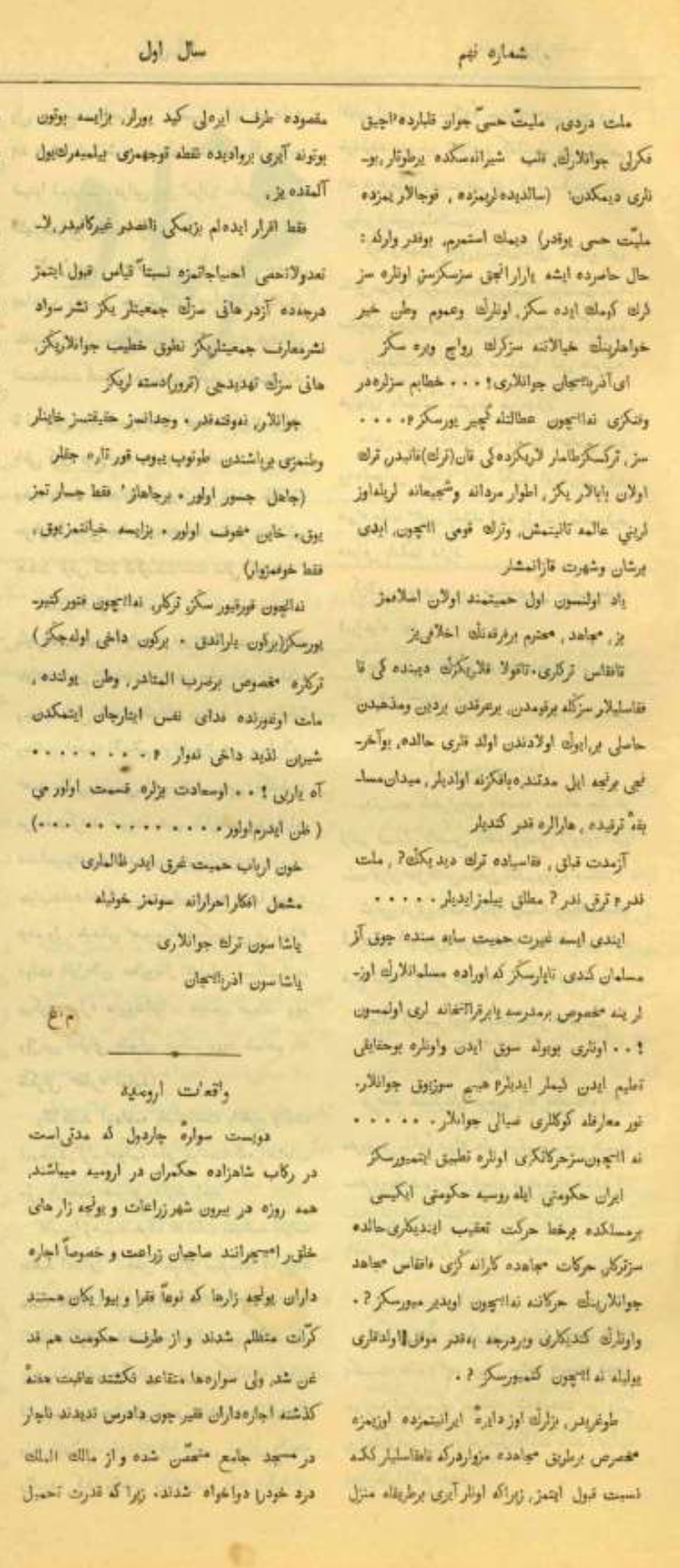 Cemşid Han Subataylı Afşar Urmulu Mecd üs-Seltene has an article in Turkish titled "Turkish Fine Arts in Iran" which was published in the "Türk Yurdu" magazine, in Istanbul in 1915. This article is the first scientific work in modern history written in Turkish by a Turk from Iran and Türkili, discussing the history and past and current state of Turkish poetry in Iran. In his article, Mecd üs-Seltene defines the "Mongol period" as the time when writing in Turkish became widespread; The "Timurid period" refers to the development of Turkish culture, including Turkish poetry and prose, as well as the period of when Turkish gained official language status. The "period after the fall of the Timurids" signifies the decline of Turkish language, literature, and writing. Finally, he sees the "Qajar period" as a time of revival for Turkish books and works. According to Mecd üs-Seltene, the decline of Turkish language, literature and writing, as well as the loss of Turkish’s official status, can be attributed to religiosity and religious conflicts. While discussing various Turkish poets, Mecd üs-Seltene mentions that their works are present in his library. Mecd üs-Seltene had several renowned libraries that housed rare and valuable books, publications, documents, and more. These libraries along with his priceless collections of antiquities, paintings, coins in Urmu, Tbilisi, and Batumi were confiscated and looted by Russia, the Christian Armed Forces, and the Iranian Constitutional Government. Mecd üs-Seltene states that the national name and endonym of his people is "Turk", and the name of their language is "Turkish". This article demonstrates Mecd üs-Seltene's extraordinary and profound knowledge of Turkish language, literature, and history, as well as the Chagatai, Turkman, and Ottoman dialects, and the Turkish-Tatar-Mongol civilization. Now, for the first time since its publication in 1915, I am republishing this unique historical article in both Arabic and Latin alphabets.